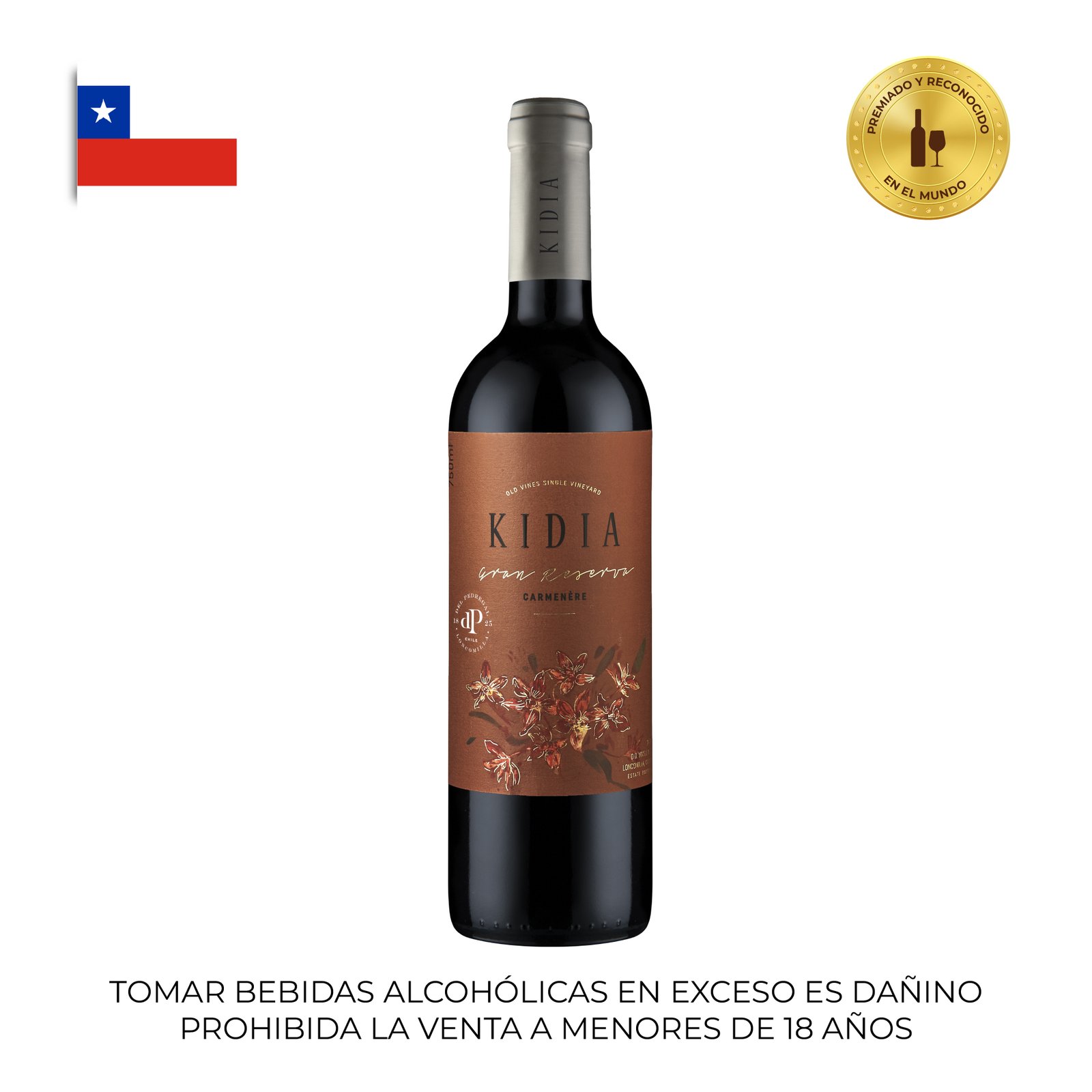 El Kidia Gran Reserva Carmenere es un vino tinto de intenso color rojo rubí con tonos violáceos, elaborado en los viñedos de Loncomilla, en el Valle del Maule. Este vino presenta aromas de cereza ácida y ciruela negra, con sutiles toques especiados. En boca es complejo, con taninos aterciopelados y sabores a frutos negros, complementados por notas de chocolate amargo. Elegante y persistente en su final, destaca por su equilibrio y estructura, siendo ideal para acompañar carnes de caza, cordero o platos especiados.