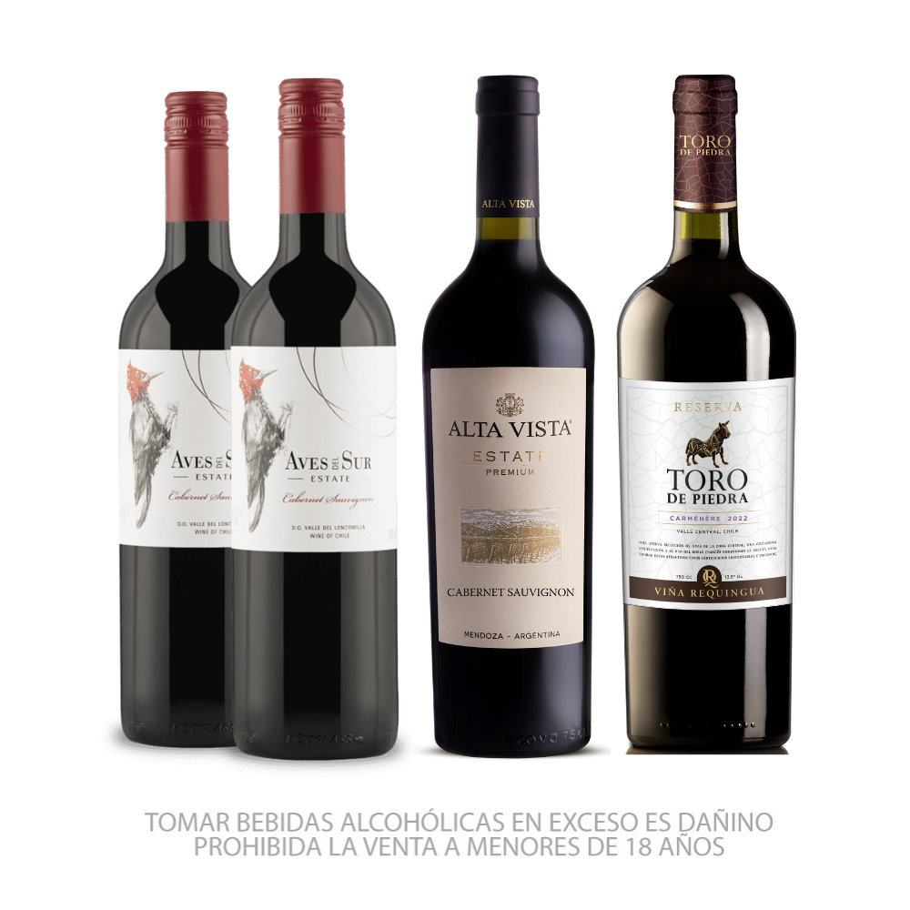 Una propuesta que reúne tres grandes exponentes del vino tinto sudamericano. Este pack combina la frescura y accesibilidad del Aves del Sur Estate Cabernet Sauvignon, la elegancia estructurada del Alta Vista Estate Cabernet Sauvignon y la intensidad del Toro de Piedra Reserva Carmenere. Tres vinos con carácter propio que, juntos, ofrecen un recorrido por diferentes estilos y terroirs, perfectos para acompañar carnes, pastas y momentos de encuentro.